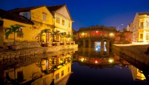Passeio a pé pela cidade antiga, visitando casas de comerciantes com mais de 400 anos, a Ponte Japonesa Coberta e o colorido mercado local.