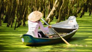Partida para My Tho, uma pitoresca localidade situada nas margens do rio Mekong. Iremos embarcar num passeio de barco para desfrutar de um relaxante cruzeiro pelo rio, de onde será possível avistar quatro ilhas — conhecidas como Dragão, Unicórnio, Tartaruga e Fénix.